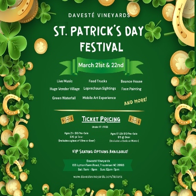 Kick off spring with the St. Patrick’s Day Spring Festival at Davesté Vineyards! This weekend will feature live music, award-winning wine, local beer, festive slushies, their famous green waterfall, food trucks, vendor village, sightings of Andy the Leprechaun, + much more!