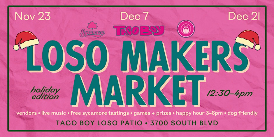 Gather on the Taco Boy LoSo patio this holiday season for their LoSo Makers Market – Holiday Edition! Each market day brings a lively mix of local vendors, live music, craft cocktails, games, prizes, and free Sycamore Brewing tastings.